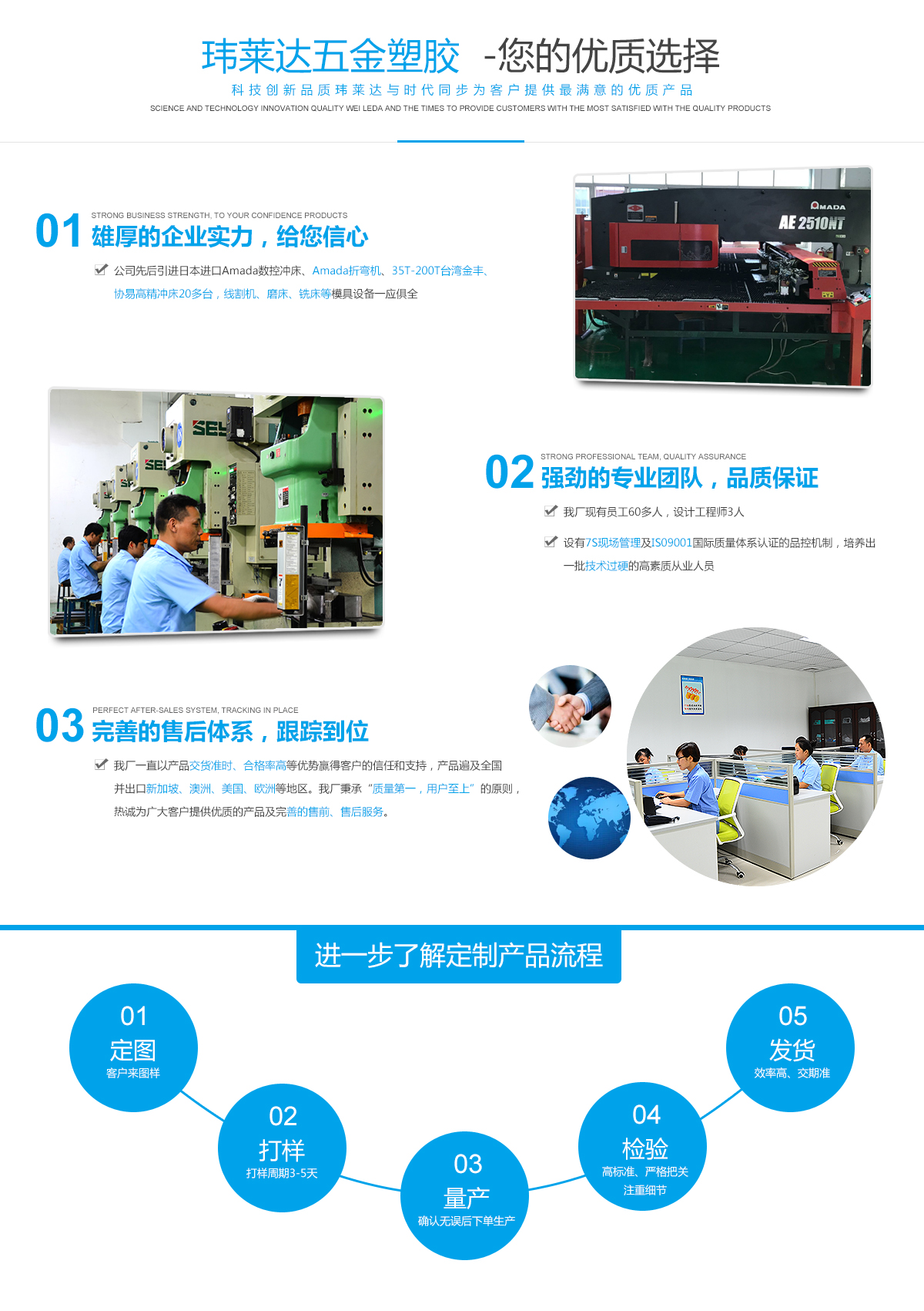 為了保證產品始終處于領先水平,公司不斷引進國內外先進高速的精密鈑金加工設備。目前,公司已經擁有日本Amada AE2510NT數控沖床、amada光纖高功率激光機、Amada RG M2 1003折彎機、35T-200T臺灣協易、金豐沖床、¢300MM萬濠數字式測量投影儀等設備多臺。